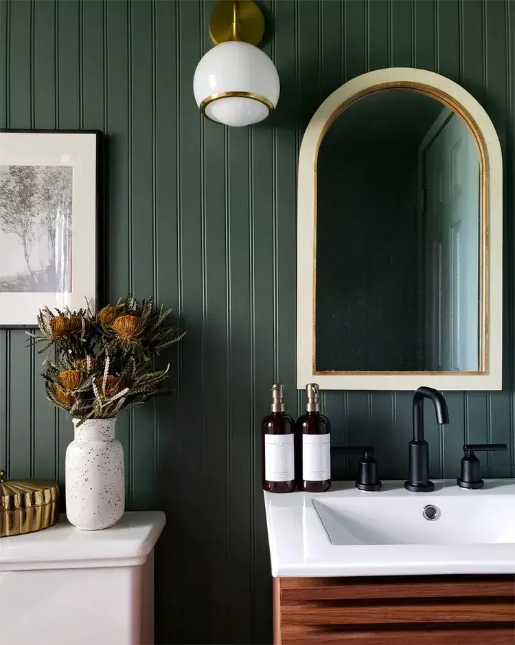 Deep greens like forest green bring coziness to a small bathroom without overwhelming it. Paired with brass or gold accents, it feels rich and timeless.