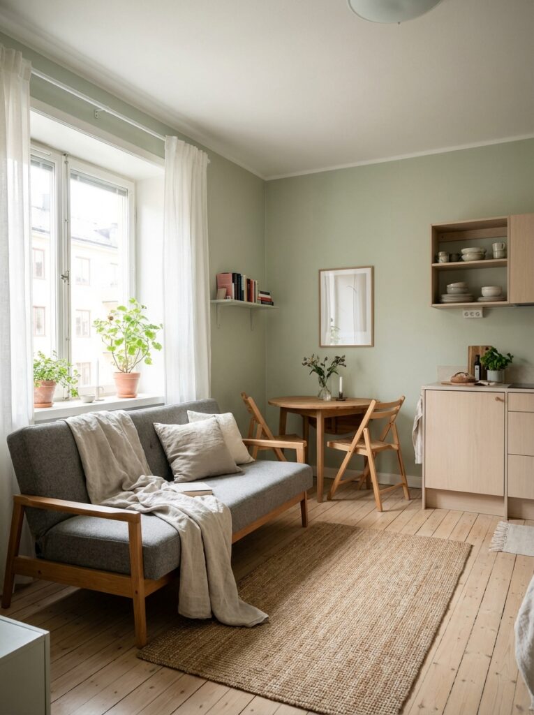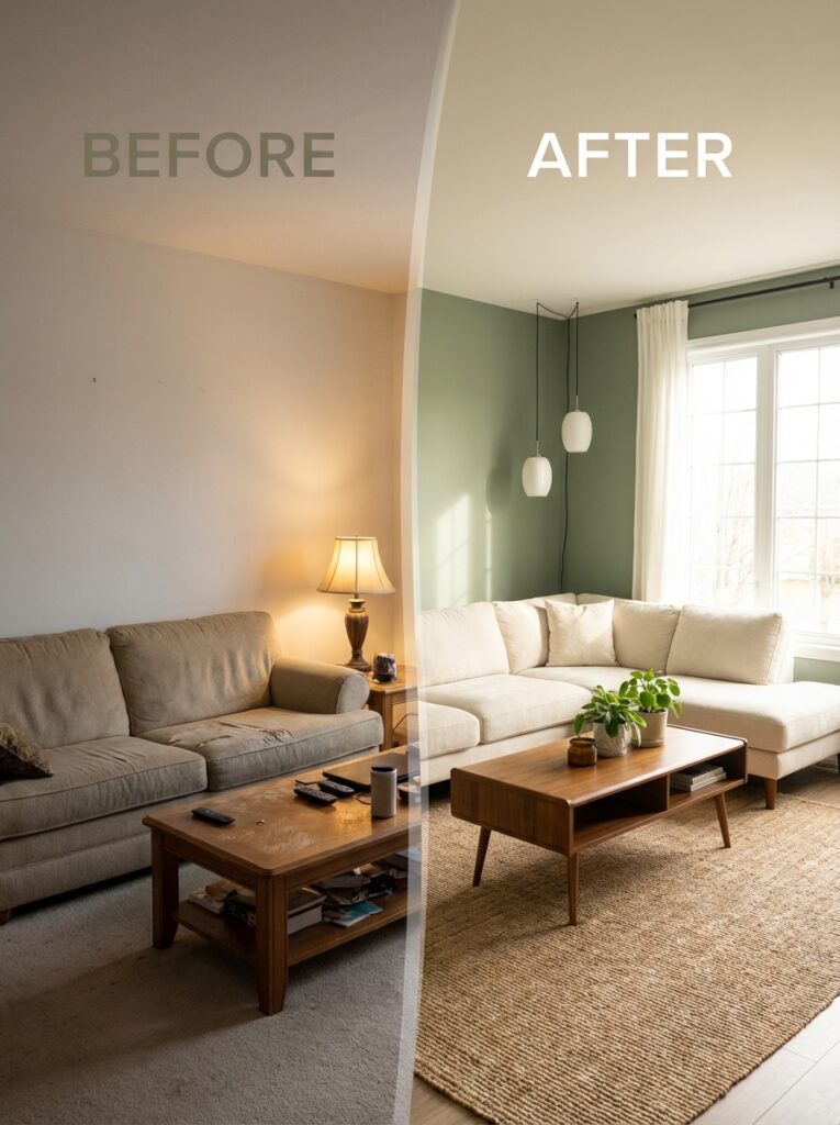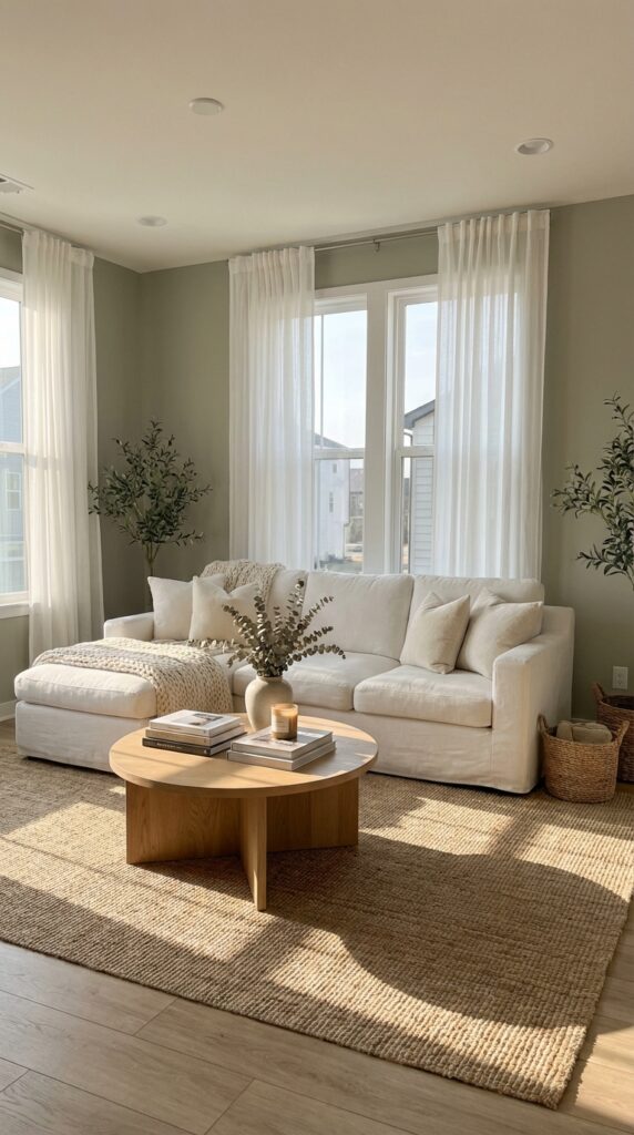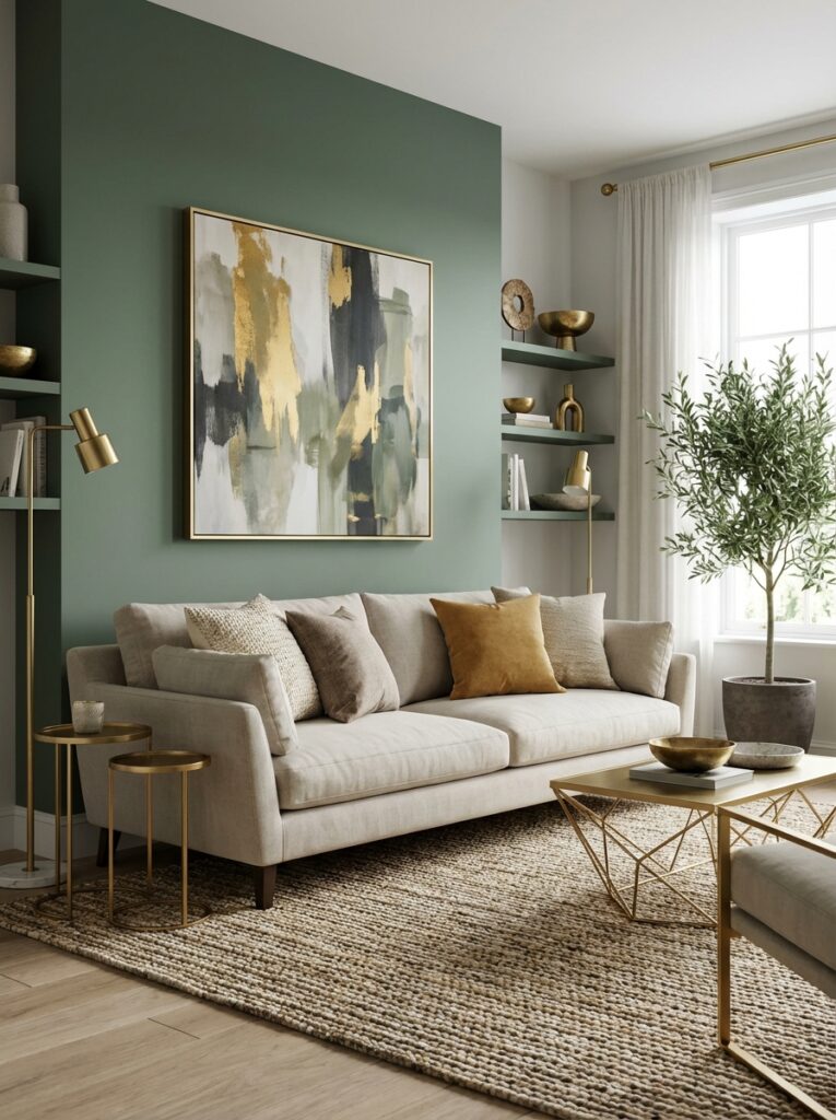 Living rooms need warmth. Sage with brown or beige undertones feels inviting instead of cold.
