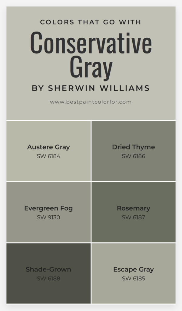 To create a beautiful color palette, pair Conservative Gray with complementary shades from Sherwin-Williams.