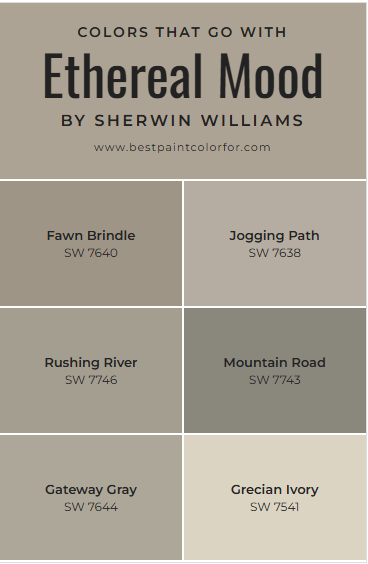 Sherwin-Williams Ethereal Mood SW 7639 is a soft, earthy neutral that blends gray, beige, and subtle green undertones. It belongs to the greige family but leans slightly organic due to its gentle green influence.