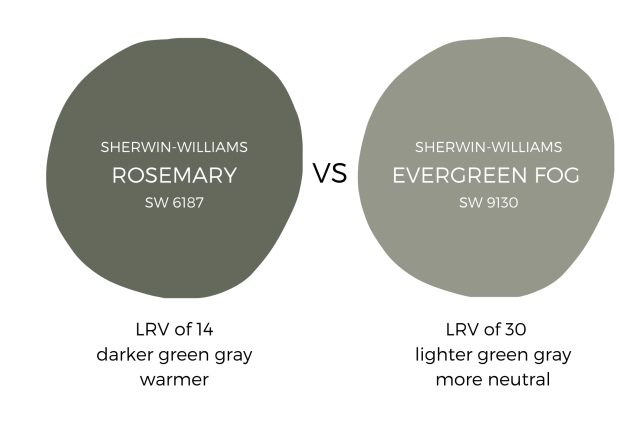 Evergreen Fog is noticeably lighter and softer than Rosemary. If your space lacks natural light or you want a more relaxed, airy feel, Evergreen Fog may be the safer option.